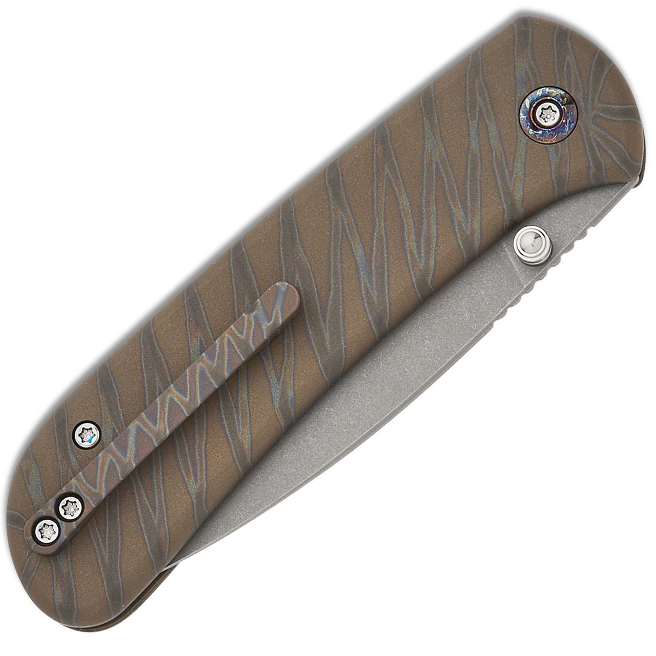 This model has tiger striped flamed titanium handles, and a gray stonewashed CPM-20CV stainless steel blade. Pocket clip is reversible. New in box.