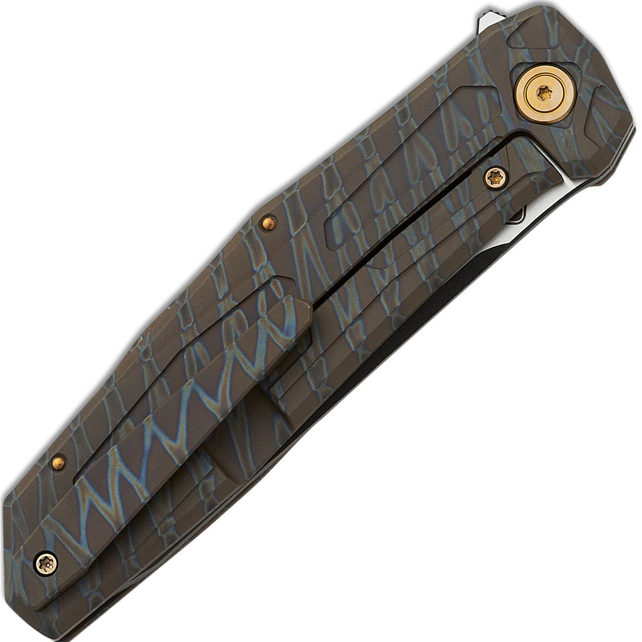 Beautiful tiger stripe flamed titanium handles with a two tone tanto CPM-20CV blade. Brand new in box.