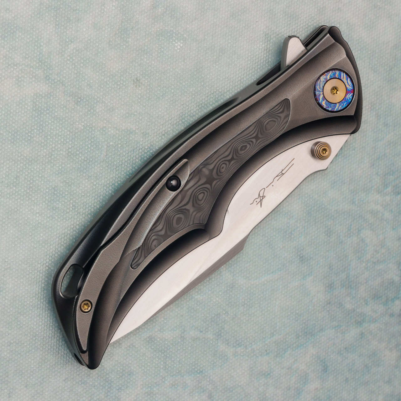 We Knife Co. Tighe Down Button Lock Orange Peel Titanium Integral Handles w/Rose Carbon Fiber Inlays Hand Satin Blade WE24054-2