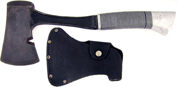 Striped aluminum and black delrin handle with big contoured aluminum pommel. Black coated high carbon tool steel full tang axe head. The axe head has a 3-inch cutting edge, nail puller, and a thick back to hammer on. Full tang stamped WESTERN CUTLERY CO. BOULDER, COLORADO, U.S.A.. Awesome antique heavy duty Western belt axe in excellent condition. Comes with a quality stitched & riveted black leather sheath.