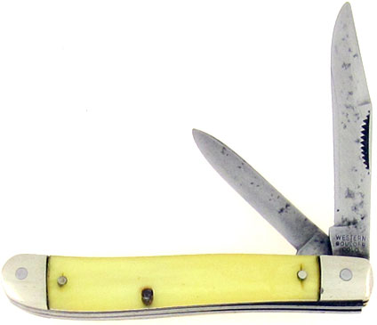 Cracked ice celluloid handle scales. Polished stainless steel swedged clip point blade with match striker nail pull and pen blade. Blades have good snap. Brass liners. Nickel silver bolsters and handle pins. Antique collectible Western pocket knife.