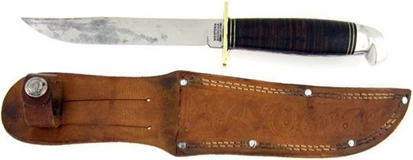 Stacked leather handle scales with black and off white spacers. Mirror polished high carbon steel narrow clip point hunting blade. Tang stamped WESTERN BOULDER, COLO. Brass double guard and aluminum pommel. This large narrow bladed hunter is good shape. Comes with original double stitched, riveted, and tooled sheath.