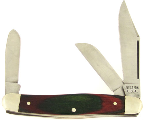 Awesome red and green pakkawood handles. Stainless steel large swedged clip point blade with nice long nail pull, sheepsfoot blade, and spey blade. Tang stamped WESTERN U.S.A. - STAINLESS W742. Blades have good strong snap. Brass liners. Nickel silver handle pins and bolsters. Real nice Western pocket knife in this ever so popular pattern. Like new unused condition.