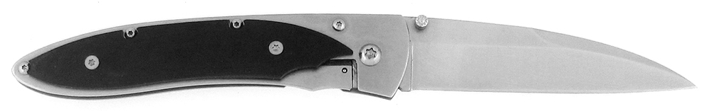 Satin finished 420 stainless steel frame with black G-10 onlays. Satin finished VG-10 stainless steel wharncliffe blade with swedging toward the tip and William Henry logo. Dual thumb studs and frame lock make for easy operation. Excellent lightweight gents knife by William Henry. Leather slip style sheath with pocket clip. This is a very early William Henry knife, one of the first models they made. Brand new in box with paperwork.