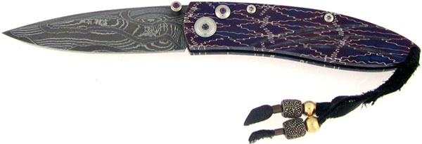 The frame of this beautiful knife is heat-blued Damascus by Chris Marks with an elegant design. The thumb stud and button lock feature premium natural purple precious gemstones. Stainless steel and titanium fittings. The lanyard bail and beads are sterling silver paired with a braided leather lanyard. Awesome Ribbon Lace Mike Norris damascus drop point blade. This beautiful knife is extremely limited in production, it is very possible that it is unique. Brand new in nice black zip up pouch.