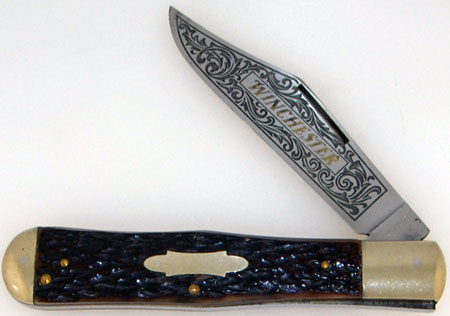 Nice jigged brown bone handles. High polished stainless steel clip point blade that has deep fancy etching and says WINCHESTER also has a nice long nail pull. The blade has real nice strong snap. Brass liners and handle pins. Nickel silver bolsters and inlaid bowtie shield. Great old Winchester knife that was made in Germany in the early 70's.