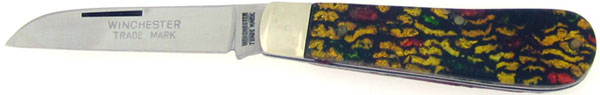 Awesome Christmas Tree Celluloid handle scales. Satin finished stainless steel wharncliffe blade etched WINCHESTER TRADE MARK with long nail pull. The blade has good snap. Steel bolsters and liners. Brass handle pins. Odd Winchester collectors pocket knife in mint condition. Never seen one like this before.
