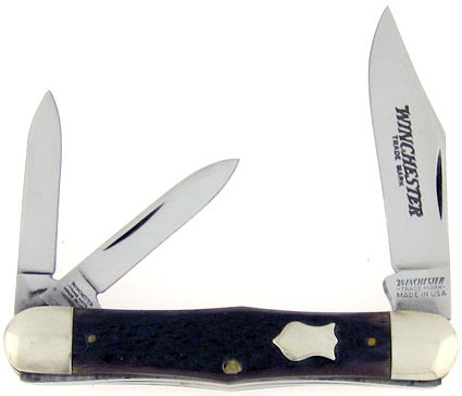 Dark jigged brown bone handle scales. High polished stainless steel clip point blade etched WINCHESTER TRADE MARK and twin pen blades. All three blades have good strong snap and tang stamps. Brass liners and handle pins. Nickel silver bolsters and inlaid crest shield. Comes in the original two piece box.