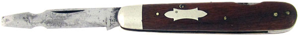 Antique hardwood handle scales. High carbon steel screwdriver blade with sharp edge and is etched CHICAGO ILLINOIS. Nickel silver bolsters, handle pins, and inlaid shield. Brass liners. Great piece in nice condition.