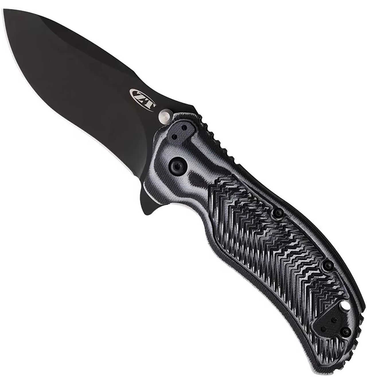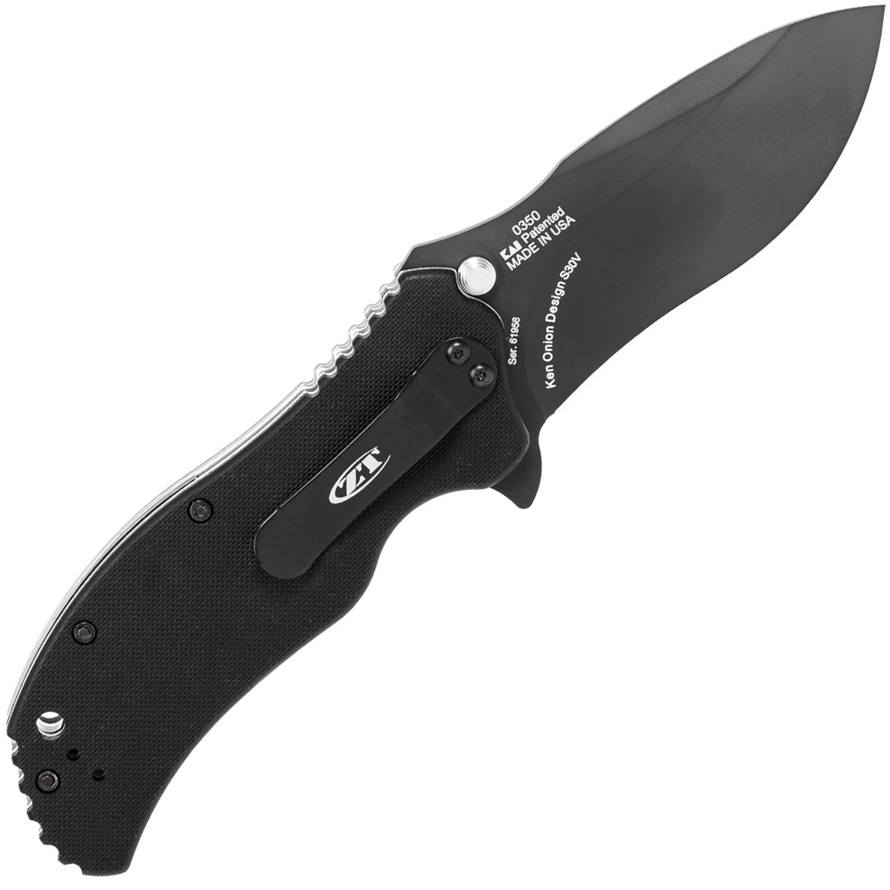The ZT 0350 is 10% smaller and lighter than the Zero Tolerance 0300. A Ken Onion design that is fully equipped with SpeedSafe for one-handed assisted opening. Even in combat gloves, the user can easily deploy the blade using the large, ambidextrous thumb stud or blade protrusion flipper. The blade is CPM-S30V stainless steel with a black cerakote coating, and a plain cutting edge. Gray and black G-10 scales provide a secure grip. Includes a pocket clip with a quad mounting system for tip-up, tip-down, left or right handed carry. Brand new in box.