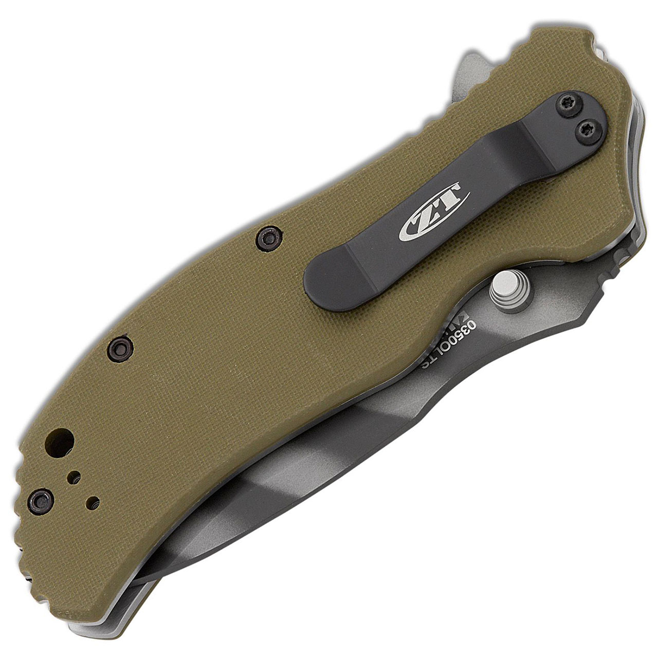 The ZT 0350 is 10% smaller and lighter than the Zero Tolerance 0300. A Ken Onion design that is fully equipped with SpeedSafe for one-handed assisted opening. Even in combat gloves, the user can easily deploy the blade using the large, ambidextrous thumb stud or blade protrusion flipper. The blade is CPM-MagnaCut stainless steel with a tiger striping finish. Textured OD Green G-10 scales provide a secure grip. Includes a pocket clip with a quad mounting system for tip-up, tip-down, left or right handed carry. Brand new in box.