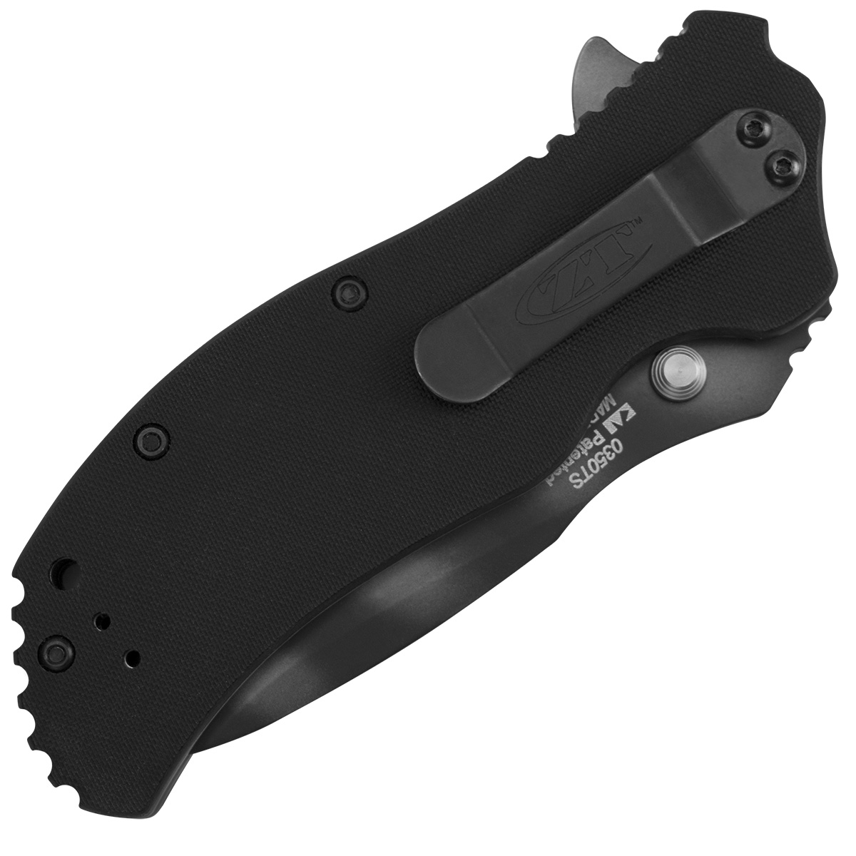 The ZT 0350TS is 10% smaller and lighter than the Zero Tolerance 0300. A Ken Onion design that is fully equipped with SpeedSafe for one-handed assisted opening. Even in combat gloves, the user can easily deploy the blade using the large, ambidextrous thumb stud or blade protrusion flipper. The blade is CPM-S30V stainless steel with a bold Tiger Stripe Tungsten DLC (Diamond Like Carbon) coating, and a plain cutting edge. CPM-S30V provides extreme durability, while the black Tungsten DLC is non-reflective, enhances hardness, and reduces friction drag. Textured matte black G-10 scales provide a secure grip. Includes a pocket clip with a quad mounting system for tip-up, tip-down, left or right handed carry. Brand new in box.