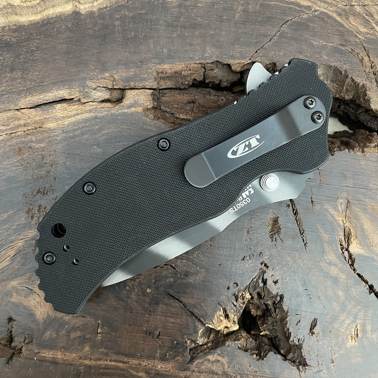 The ZT 0350 is 10% smaller and lighter than the Zero Tolerance 0300. A Ken Onion design that is fully equipped with SpeedSafe for one-handed assisted opening. Even in combat gloves, the user can easily deploy the blade using the large, ambidextrous thumb stud or blade protrusion flipper. The blade is CPM-S30V stainless steel with a plain cutting edge. CPM-S30V blade finished with tiger striping. Textured black and gray G-10 scales provide a secure grip. Includes a pocket clip with a quad mounting system for tip-up, tip-down, left or right handed carry. Brand new in box.