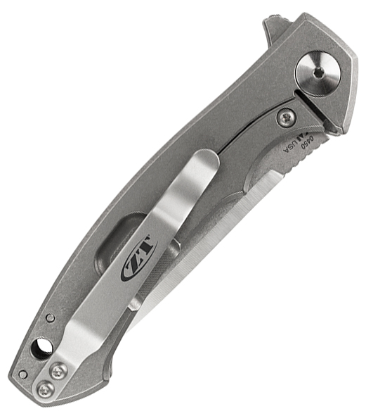 ZT built it with an S35VN stainless blade that sharpens to a razor edge, holds it well, and can be resharpened easily. The knife opens smoothly and easily with the KVT ball-bearing opening system and built-in flipper. A titanium frame lock with hardened steel lockbar insert ensures solid lock up. Polished pivot hardware just adds to the 0450's refined good looks. Brand new in box.