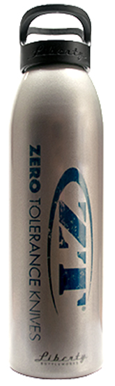 If you have Zero Tolerance for boring water bottles, choose this one from ZT instead. The ZT logo stands out against the brushed aluminum silver of the bottle. Constructed of recycled aluminum, it's BPA-free and Made in the USA. The ZT Logo Water Bottle holds 24 ounces of hydration and is reuseable, helping keep plastic bottles out of landfills. Secure cap—just twist to hear the click so you know it's sealed.