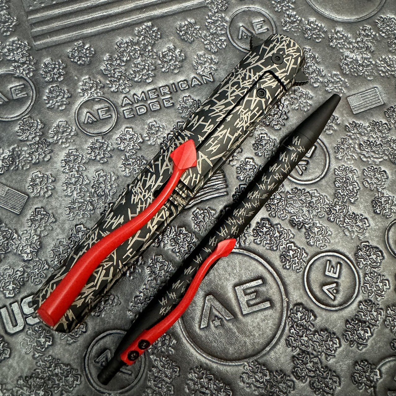 This Nine flipper by Michael Zieba features a black blade with false top edge and simulated hamon, notched flipper. The handle has a black titanium frame with "HAHA" joker graphic, brass skulls inlay and backspacer, red titanium clip with hidden screws. Has stainless steel lockface insert. Blade is on bearings and has nice action. Comes with a zippered case with bead, cleaning cloth, and COA dated 8-8-23. Comes with a matching click pen. Brand new in box.