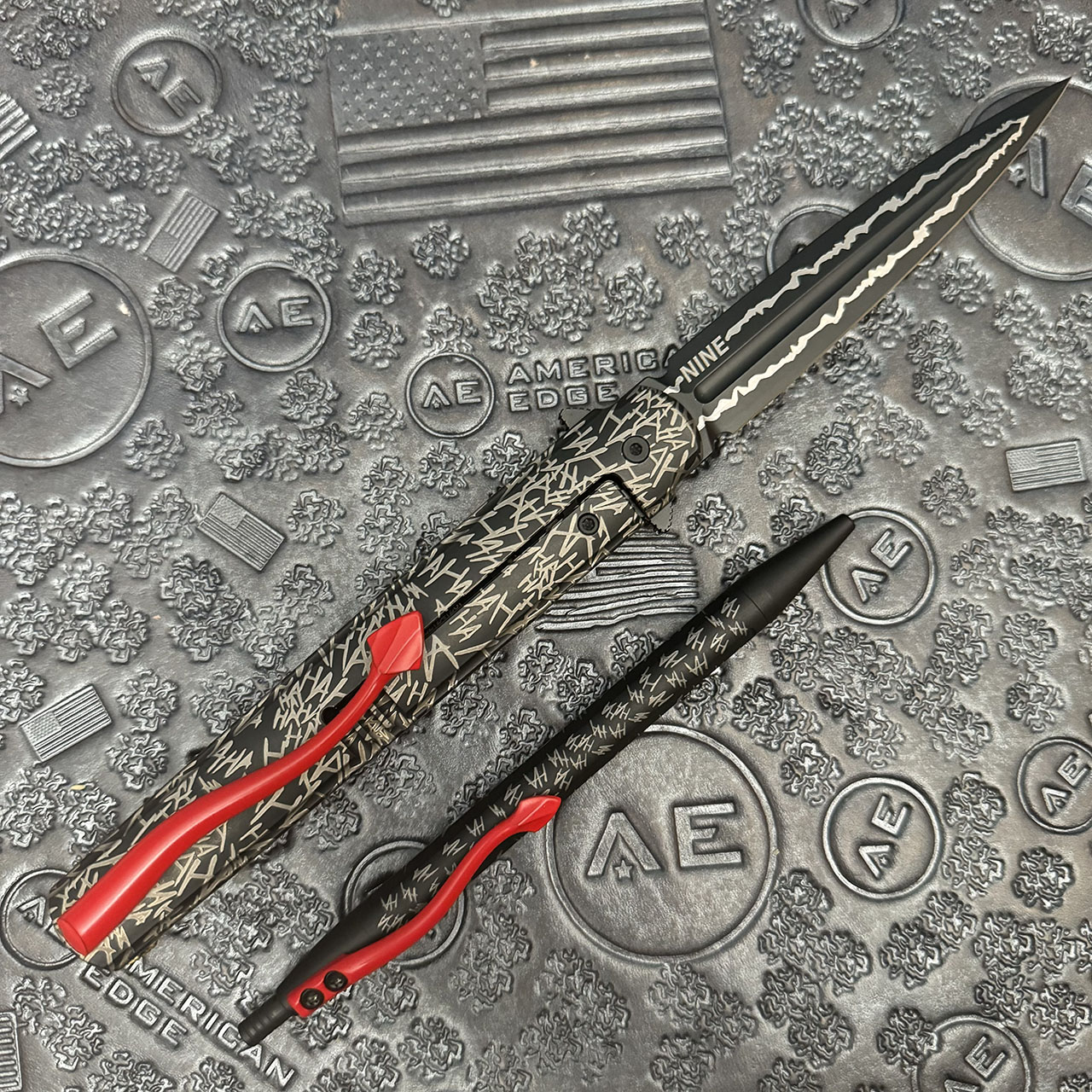 Zieba Knives Nine Frame Lock Black HAHA Joker Graphic Titanium Handle w/Brass Skulls Inlay Black Dagger Blade and Matching Click Pen Set