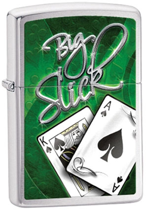 Polished stainless steel complete construction. The face is embossed with the Ace and King of Spades and says BIG SLICK. The bottom is stamped ZIPPO BRADFORD, PA. MADE IN U.S.A. Another fine refillable wind proof lighter by Zippo. Makes a great gift and is great for engraving. Comes brand new in a nice black Zippo display box.