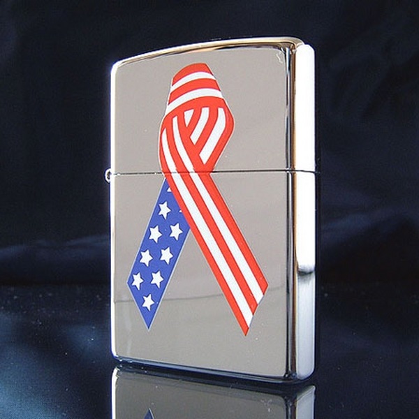 High polished stainless steel complete construction. The face is embossed with an American Flag Untiy Ribbon. The bottom is stamped ZIPPO BRADFORD, PA. MADE IN U.S.A. Another fine refillable wind proof lighter by Zippo. Makes a great gift and is great for engraving. Comes brand new in a nice black Zippo display box.
